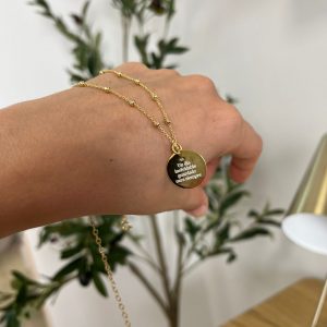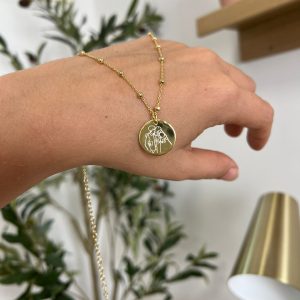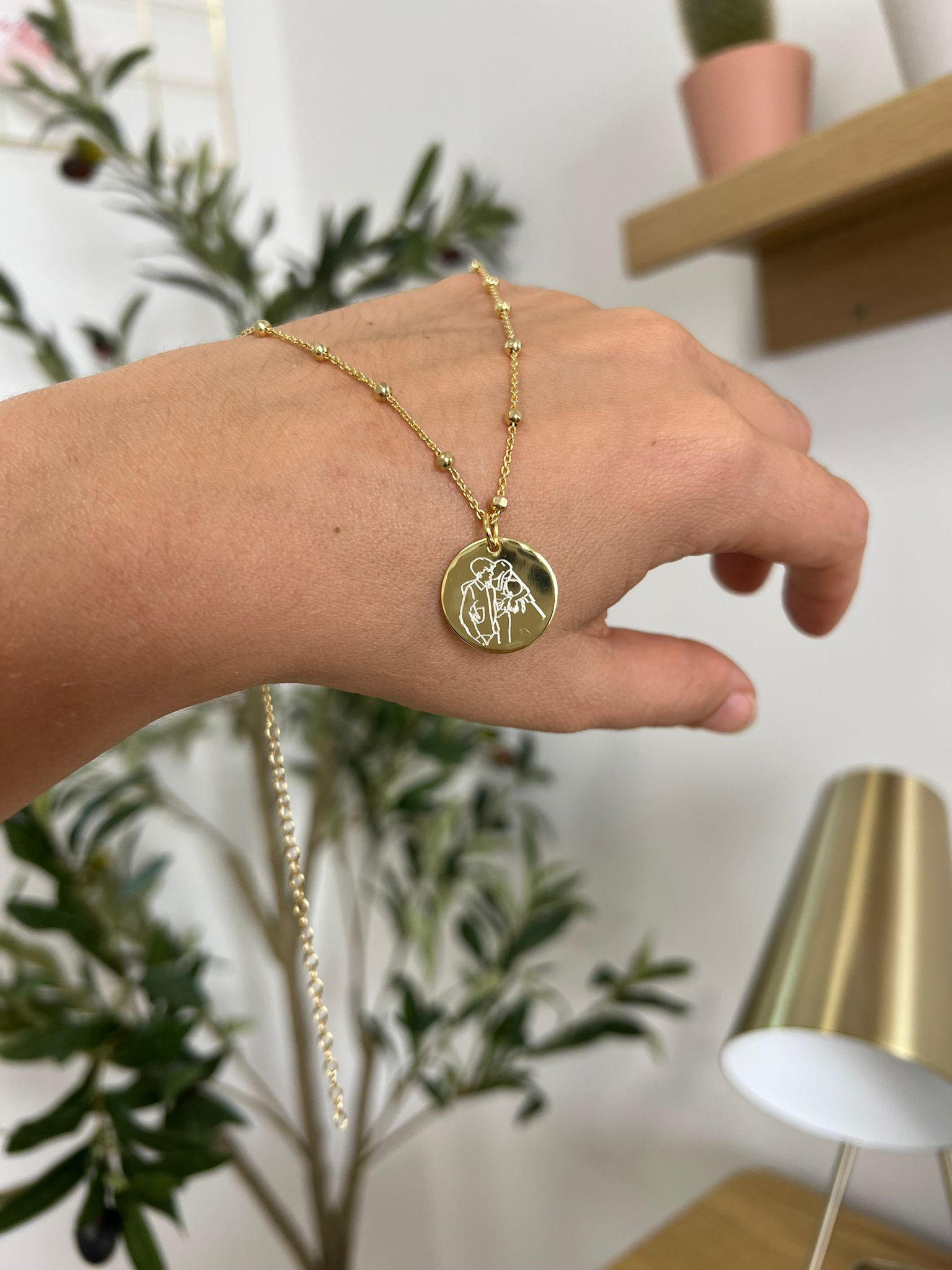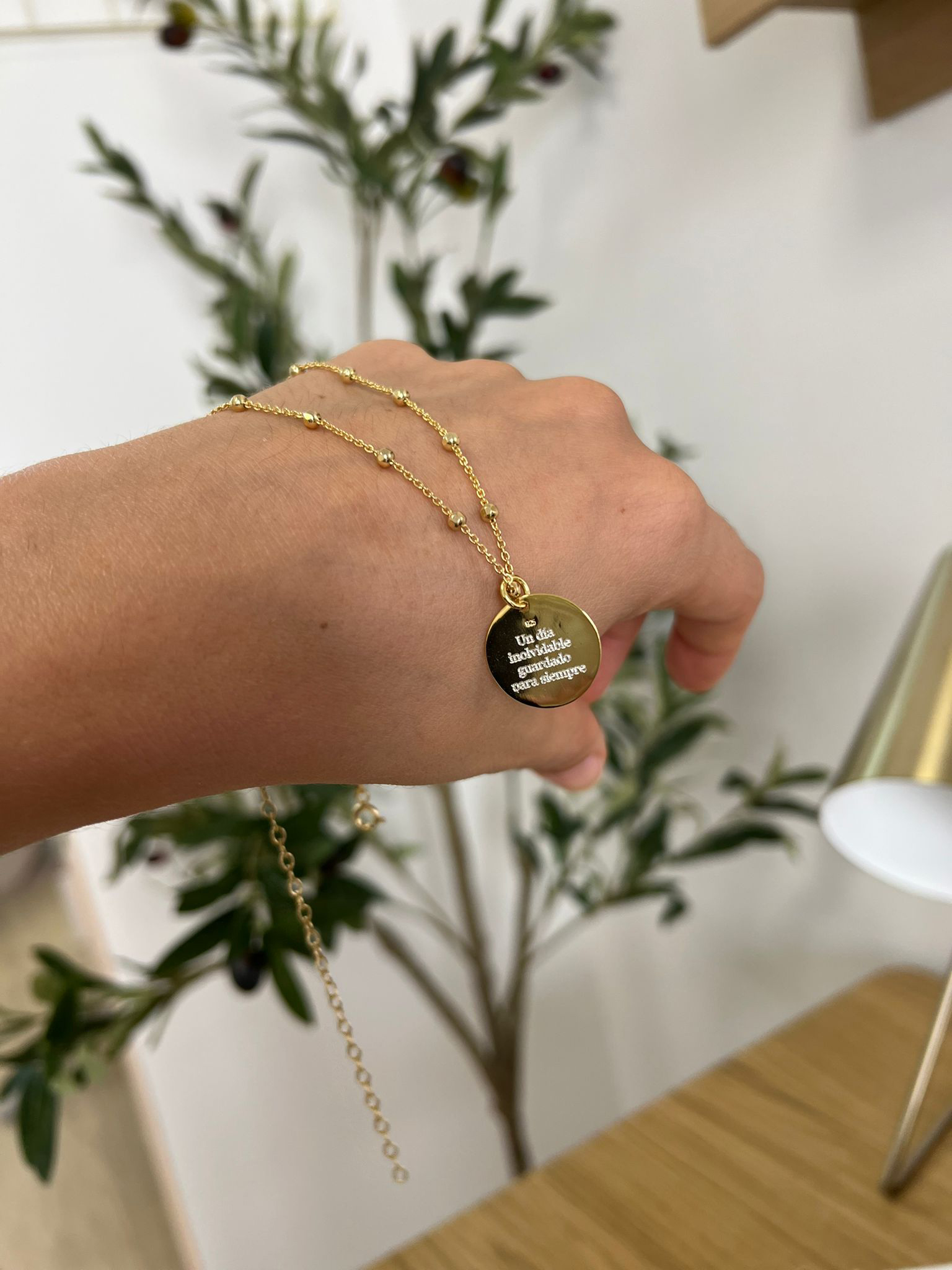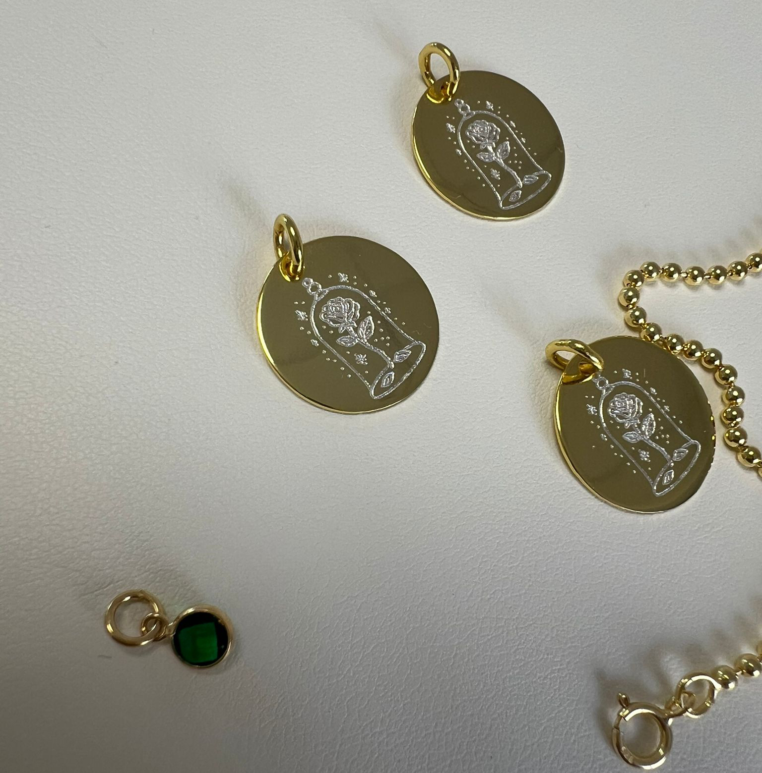 Descubre nuestro charm redondo de plata bañado en oro, diseñado para llevar tus momentos más especiales siempre contigo.