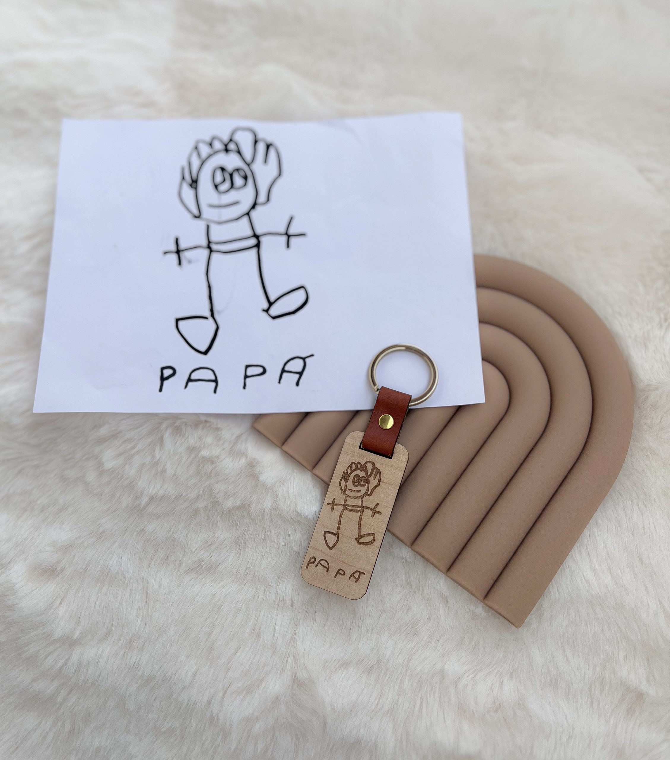 Llavero de madera y cuero con el dibujo de tu peque.