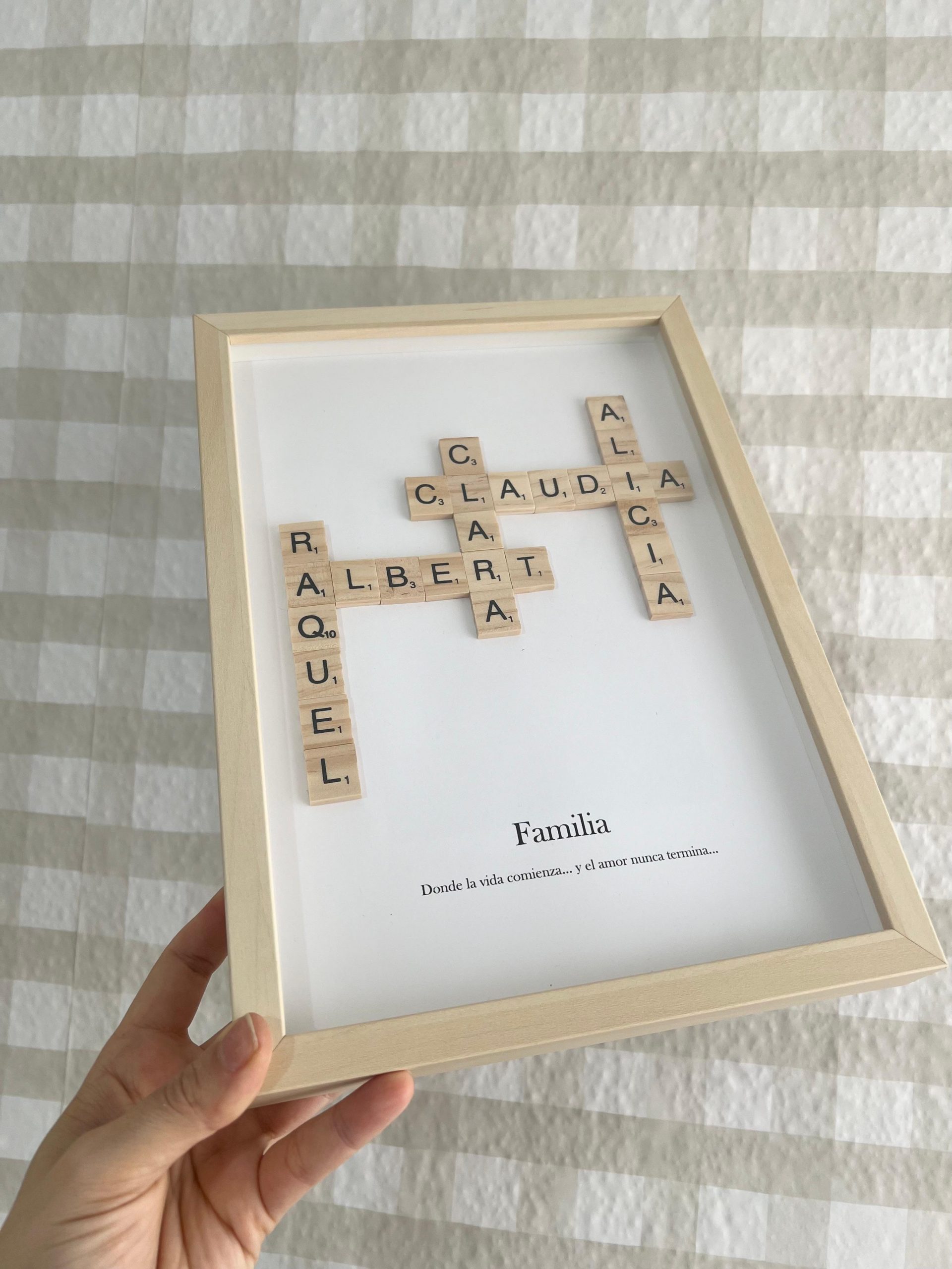 Dale un toque único y especial a tu espacio con este marco personalizado, hecho con fichas de madera inspiradas en el clásico juego de Scrabble.